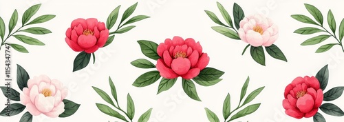 A seamless floral pattern featuring peony flowers against a summer backdrop, created in watercolor. Ideal for textile, interior, clothing, and wallpaper designs. Botanical art.