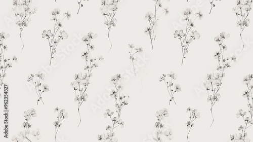A seamless pattern featuring delicate black and white botanical illustrations. The repeating design is ideal for backgrounds, textiles, and other decorative applications, emphasizing simplicity and