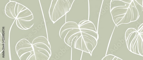 A seamless pattern of delicate line art monstera leaves, their organic shapes and soft curves captured in an elegant white outline on a muted sage green background
