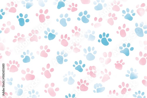 A seamless pattern of pastel-colored cat paw prints scattered across the white background, creating an adorable and playful design for pet lovers