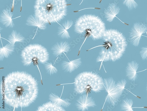 A Seamless Pattern of White Dandelion Seed Heads with Greenish/Light Brown Stems on a Turquoise/Bluish-Green Background