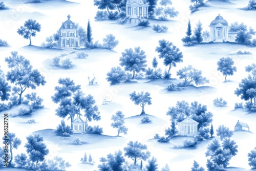 A seamless Toile De Jouy pattern in classic blue hues, featuring intricate pastoral landscapes