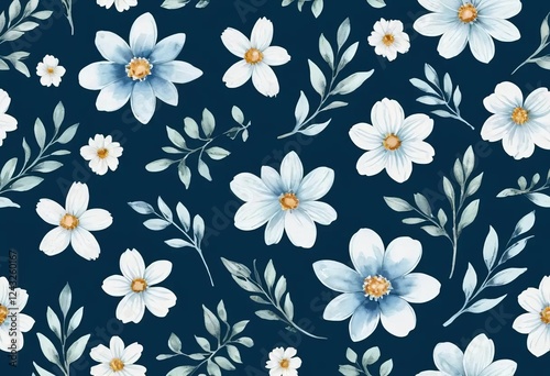 blue background, white flower, floral pattern, digital artwork, home decor, fabric design, graphic design, textile design, color palette