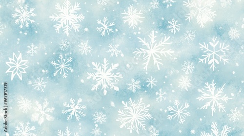 A seamless winter background with delicate snowflakes in white and light blue, creating a soft, seasonal feel