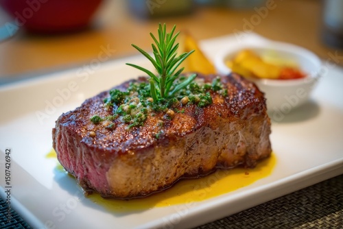 steak, meat, food, plate, white, rosemary, garnish, sauce, green, herb, potato, side, dish, meal, eatery, cooked, cookery, grill, delicious, epicure, lunch, dinner, savoury, juicy, cut, beef, fat, pepper, garlic, spice, seasoning, presentation, dining, freshness, culinary, nourishment, protein, delicacy, rich, tasty, tender, brown, appetising, closeup
