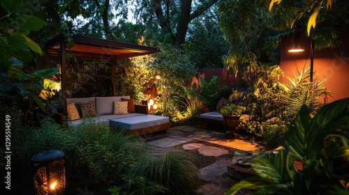 A secluded backyard retreat with a private garden sitting area enclosed by lush greenery.