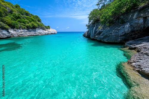 secluded, cove, turquoise, water, surrounded, infused, cliff, lush, vegetation
