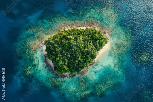 A secluded tropical island thrives with lush greenery and is surrounded by a turquoise sea. The vibrant coral reef completes the breathtaking natural landscape.
