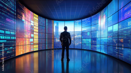 A security expert in front of multiple computer screens in a network operations centre near a server room. Cybersecurity, Cyber awareness training. Generative AI.