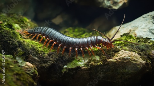 arthropod, centipede, invertebrate, creature, nature, animal, wildlife, close, up, macro, segment, segment, leg, antennae, detail, body, texture, rugged, moss, green, rock, stone, environment, crawl, creeping, dark, black, brown, orange, insect, wilderness, view, closeup, natural, terrain, surface, pattern, biology, fauna, structure, scale, species, life, forest, ground