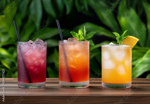 A selection of colorful refreshing cocktails served on a wooden table with lush greenery