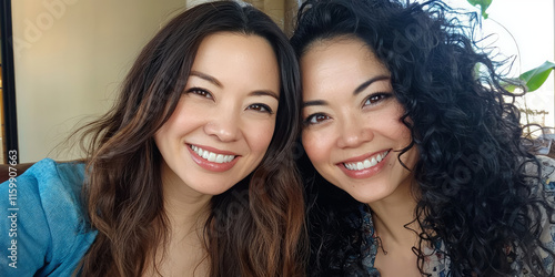 A selfie of two Japanese women, one with long brown hair and the other with curly black hair, both smiling for the camera, generative AI
