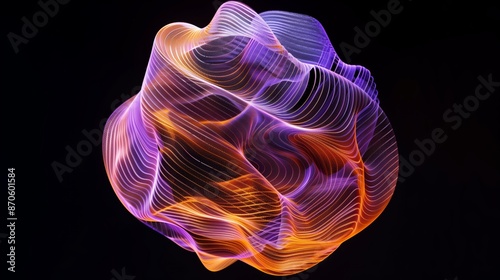 A semi-transparent gradient sphere made of purple and orange wavy lines, on a black background.