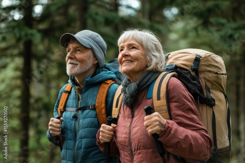 A senior couple hikes through a lush forest, breathing in the fresh air and appreciating nature. They carry backpacks and smile joyfully as they connect with the outdoors