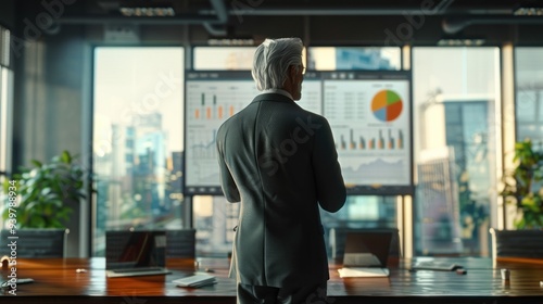 A senior financial analyst presenting a market report in a boardroom with large windows, highlighting investment and money management.