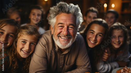 A senior man shares a joyful moment with his smiling grandchildren during a cozy family dinner