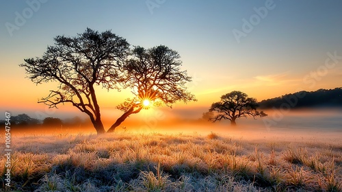 serene, mystical, scene, essence, dawn, sun, ray, softly, peep, through, blanket, thick, fog, illuminating, gnarled, tree, dew, covered, grass, distance