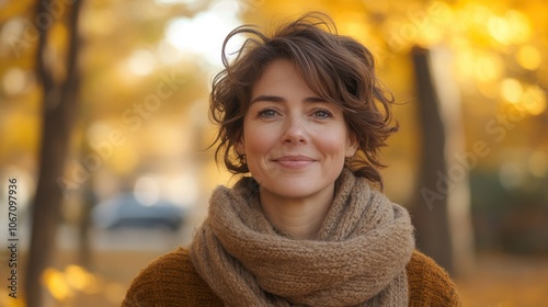 autumn, woman, nature, smiling, cosy, foulard, happiness, calmness, foliage, park, casual clothes, warm tones, joy, portrait, beauty, lifestyle, scenic, relaxation, sunshine, peaceful, candid, closeup, hair, expression, warmth, environment, tree, cheerful, glowing, serenity, leisure, personality, soft light, community, connection