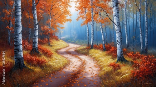 autumn, tree, path, leaf, nature, forest, sunlight, calmness, scenery, outdoors, foliage, birch, peaceful, landscape, beauty, colours, seasonal, environment, bright, warm, rustic, winding, vibrant, serene, mist, rural, scenic, earth, harmony, timberland