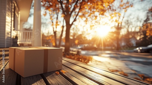 A serene autumn scene featuring a delivery package on a wooden porch at sunset. The warm light filters through trees, creating a cozy atmosphere.