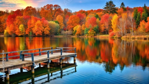 A serene autumn scene with a wooden fishing pier standing alone by a lake or river edge with trees changing colors red and orange in the background, red autumn, serene atmosphere