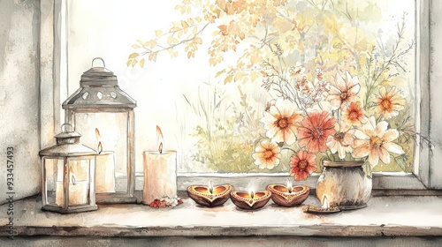 home decor, celebration, window, oil, lamp, lantern, autumn, floral, arrangement, flower, glowing, light, decor, peaceful, serene, ambience, warm, inviting, bright, atmosphere, nature, cosy, relaxing, indian, traditional, cultural, tranquil, artistic, decoration, illuminated, natural, sunlight, elegant, beautiful