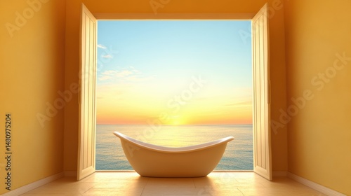 A serene bathroom scene features a modern bathtub framed by wide open doors, revealing a stunning sunset over calm waters, Ideal for wellness, relaxation, or home decor projects,