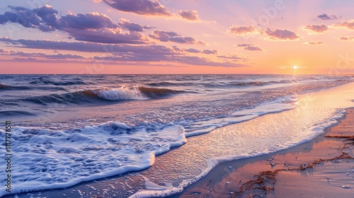 A serene beach at sunset, with the sky painted in shades of pink, orange, and purple, and gentle waves lapping the shore