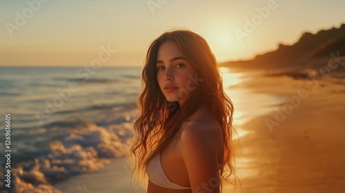 A serene beach scene at sunset featuring a young woman with wavy hair, enjoying the moment by the shore as the waves gently lap at her feet.