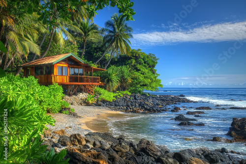 beach, house, ocean, rock, palm, tree, water, nature, landscape, vacation, tropical, scenery, sunlight, peaceful, coast, wave, shore, retreat, relaxation, paradise, environment, flora, fauna, summer, travel, escape, idylli, adventure, calmness, view, sky, blue, greenery, vacationing, rustic, horizon, seascape, marin, wildlife, exploration, serenity, beauty, coastline, sand, leisure, habitat, ecosystem