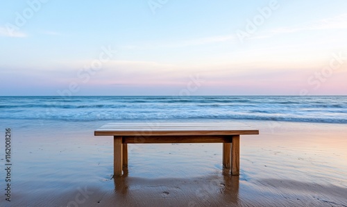 beach, table, ocean, wave, sunset, sand, water, horizon, sky, calmness, nature, landscape, wood, calm, peaceful, furniture, scenery, coastal, summer, relaxation, vacation, sunlight, environment, aesthetic, shore, minimalism, simplicity, beauty, atmosphere, marin, evening, dusk