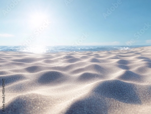 A serene beach scene featuring soft, undulating sand with gentle waves lapping at the shore under a bright, sunny sky.