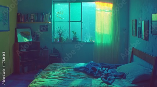 bedchamber, window, plant, bed, blanket, light, water, decor, furniture, colours, calmness, atmosphere, interior, shadow, reflections, curtain, art, peaceful, cosy, space, home, comfort, design, relaxation, environment, sleep, nature, blue, green, warmth, style, creativity, aesthetic, ambience, arrangement, simplicity, organisation, harmony, vibe, mood, scenery, stillness, calm, softness, texture