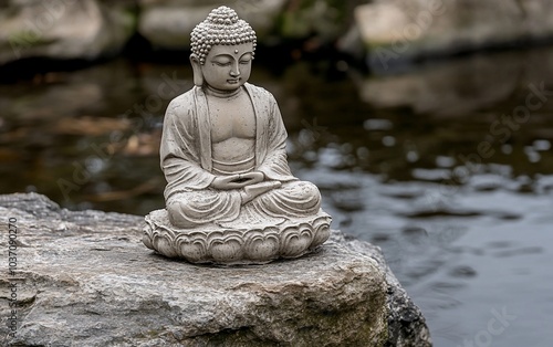 A serene Buddha statue meditates on a rock by a tranquil stream.