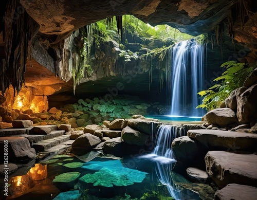 A serene cave with a glowing waterfall, crystal-clear pool, and lush green plants illuminated by soft lights.