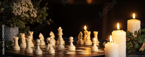 A serene chess scene with ivory pieces and candles, creating a calm atmosphere.