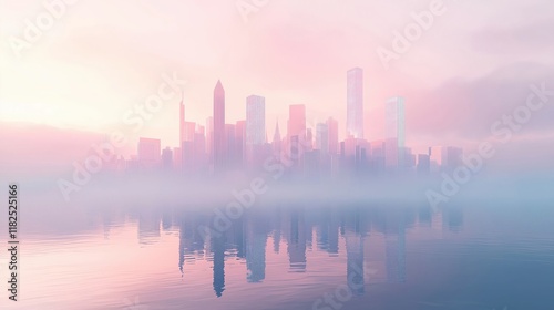 A serene city skyline reflecting on calm water during sunrise with soft pastel colors.
