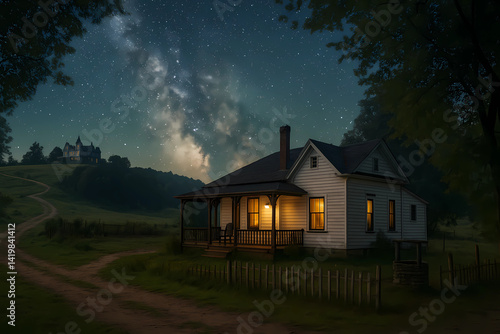 A serene countryside night scene with a warmly lit wooden cottage under a starry sky, surrounded by trees and a distant manor, evoking peace and nostalgia.
