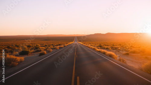 A serene desert highway stretches towards the horizon at sunset, with warm hues illuminating the tranquil landscape.