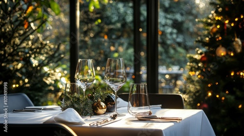 A serene dining experience with a wine glass on a table, surrounded by lush Christmas trees, with sunlight filtering through large clear windows.