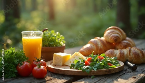 A serene forest breakfast featuring croissants, fresh fruit, and juice, perfect for a camping vacation in nature