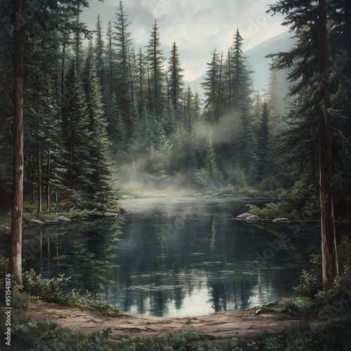 forest, landscape, serene, calm, reflective, duck pond, water, nature, tree, pine tree, mist, calmness, peaceful, stillness, greenery, natural, outdoors, scenery, wilderness, mirror-like, fog, environment, timberland, harmony, soft light, lush, quiet, peacefulness, misty, atmosphere, idylli, calm water, green, scenic, nature scene