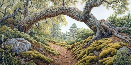 forest, path, tree, nature, greenery, landscape, moss, calmness, sunlight, wilderness, scenery, foliage, earth, rock, outdoors, environment, flora, peaceful, hiking, adventure, growth, ecosystem, beauty, timberland, travel, exploration, branch, root, serenity, biodiversity, trail, texture, colours, season, habitat, plant, fresh, air, natural, surrounding, wildlife, rejuvenation, calm, escape, journey, shadow, light