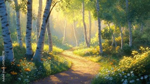 A serene forest path illuminated by sunlight, surrounded by vibrant flowers and trees.