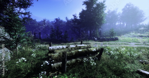 A serene forest pathway features stacked logs surrounded by wildflowers and lush greenery. Morning light filters through trees, creating a peaceful ambiance.