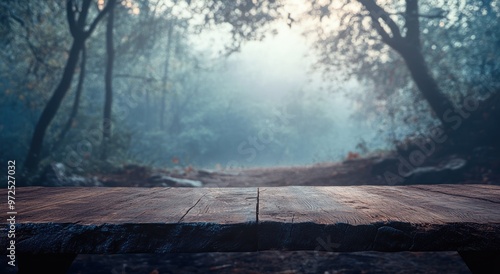 A serene forest scene with a wooden table in the foreground and misty trees in the background.