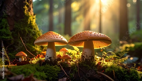 A serene forest scene with vibrant mushrooms