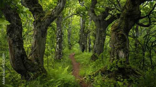 a serene forest with a narrow trail leading through a grove of ancient trees