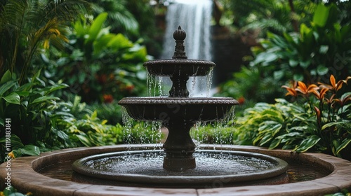 A serene fountain with cascading water surrounded by lush greenery and a waterfall in the background.