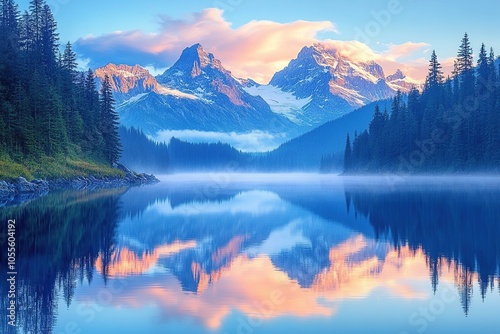 A serene high-resolution landscape of a calm mountain lake surrounded by towering pine forests. Snow-capped peaks reflect perfectly on the mirror-like water surface under a pastel-colored dawn sky.
